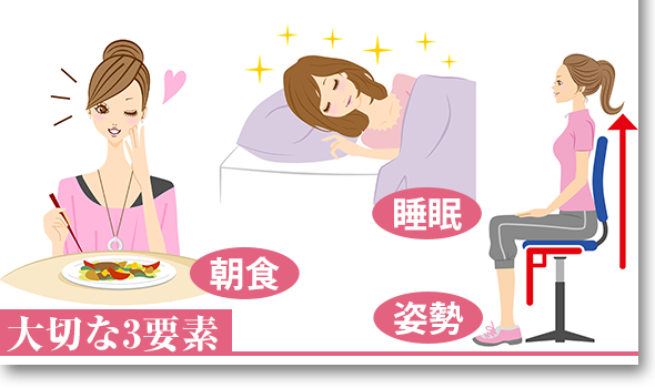 まず、食べなければ痩せるというのは大きく間違っています。 もちろん炭水化物や糖質の摂りすぎは肥満の元凶ですからなるべく避けるべきですが、必要な栄養を必要な分、3食しっかりと食べることが大切です。 特に朝食を抜く生活習慣はもっての他です。 朝食を抜くと午前中の代謝が下がり、燃えるはずの脂肪も燃やすことができません。 また、朝食を食べない人は食べる人よりも肥満になる確率が高いというデータもありますので、朝食は必ず食べましょう。 また、食べるときにあまり噛まずにすぐに飲み込んでしまう人もいますが、よく噛んで時間をかけて食べるよう心がけてください。 食事の生活習慣でもう一点、食事の時間も痩せやすい体質づくりには欠かせない要素です。 夜はあまり体を活発に動かす時間帯ではないため、できるだけ深夜の食事は控えることが大切です。 食事以外の生活習慣も見直すべき点があります。 まずは姿勢です。 姿勢が悪いと骨盤が歪み、脂肪がつきやすい体になってしまいます。 常に正しい姿勢を心がければ直すことも可能ですから、意識することから始めてみてください。 そして睡眠です。 睡眠中は体脂肪を分解し、エネルギーに変えるコルチゾールというホルモンが分泌されます。 また、脂肪燃焼作用のある成長ホルモンも同時に分泌されます。 これらは睡眠中も多くのカロリーが消費されていることを意味します。 睡眠不足はお肌にも悪いですが、痩せやすい体質づくりにも悪影響でしかありません。