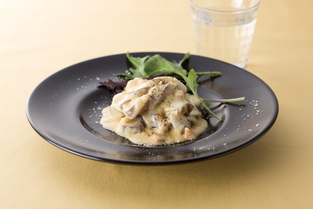 ①板こんにゃくを5mm幅のスライス、もしくは手で一口大にちぎり、湯がいておく。 ※写真はねじりこんにゃくにアレンジしています。 ②にんにくはみじん切りに、玉ねぎはスライス、ベーコンは1cm幅でカットする。 ③冷たい状態の鍋にオリーブオイルを入れ、にんにくのみじん切りを加える。弱火で、焦げないように鍋を揺すりながら香りを出していく。 ④③にベーコンを加える。ほんのりキツネ色になってきたら玉ねぎのスライスと塩をひとつまみ入れ、しんなりするまで弱火で炒めていく。 ⑤湯がいたこんにゃくと生クリームを加える。こんにゃくに味が染み込むようにじっくり煮ながら、クリームソースに若干濃度がつくまで煮詰め、塩で味を調える。 ⑥一度火を止め、溶いた卵黄を加え、余熱で熱を通していく。 ⑦卵がとろとろになったら器に盛り付け、上から粉チーズとブラックペーパーを振りかけて完成。