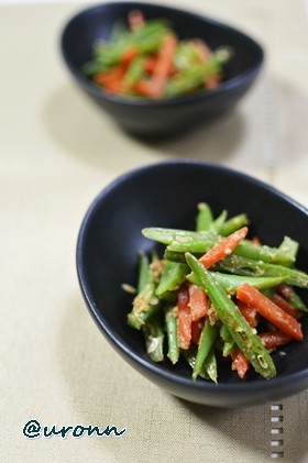 ①インゲンマメと人参のアーモンドあえ (レシピ参照: http://cookpad.com/recipe/1619526 より抜粋) まめ類トップのポリフェノールを含むインゲンマメ×βカロテンのボス人参×ビタミンEが豊富なアーモンドの抗酸化作用抜群レシピ! あと一品たりないなあ。と感じたら、さくっと作れるのがおすすめです。